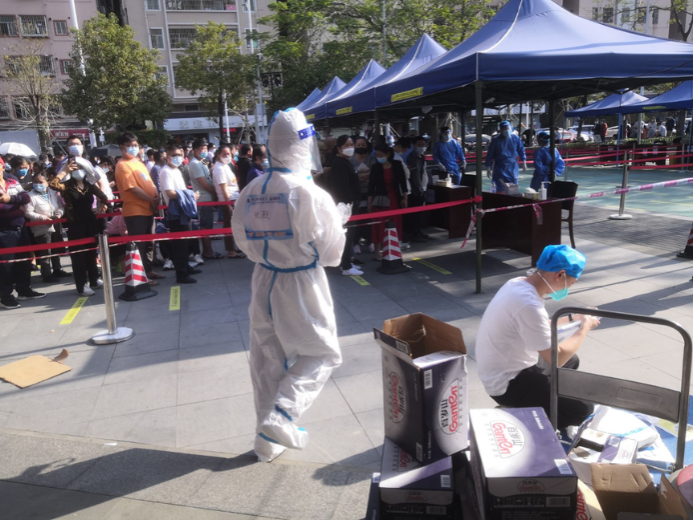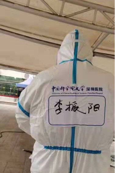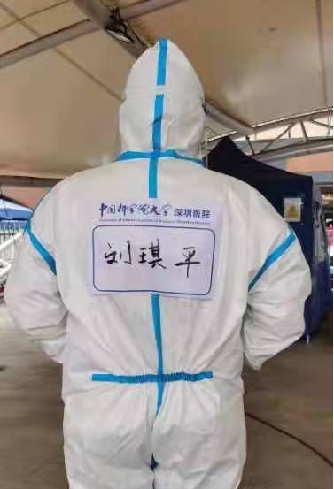 2022年1月7日,刚抵达中国科学院大学深圳医院的实习队伍还未来得及休整便面临了挑战——疫情爆发。刘翔、张颐、刘琪平、李振阳、陈娃宜几位同学接到老师的通知后便进行了穿脱防护服和采样流程的紧急培训,之后就前往各个社区、商场等地为市民进行核酸采样。从1月到3月,几位同学多次出勤,每次采集时间超过五个小时,个人累计采集人数上千人。在炎热的天气下穿防护服更是让大家酷热难耐,但是几位同学毫无怨言,工作辛苦时互相加油打气,为彼此增添动力。当看到商铺关门,原本繁华的街道变得冷冷清清时,那份责任感更是涌上心头,使得几位同学更加努力工作,为深圳的成功“摘星”做出了自己的一份贡献,也展现了南华公卫人应有担当。