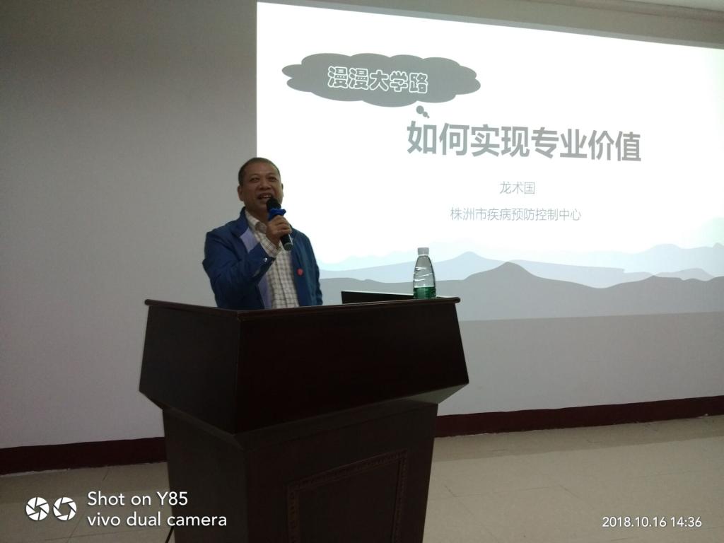 10月16日下午,best365英国在线体育特邀株洲市疾病预防控制中心主任龙术国、纪委书记李竹清书记等人于南华大学红湘校区三教101室开展关于大学之路如何实现专业价值的专题讲座。讲座由院长龙鼎新主持,到场的有院党委书记张天成、党委副书记田生军等,与会人员为16-18级学生。