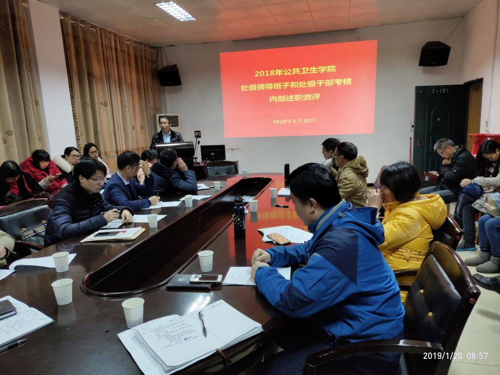 1月20日上午8点至10点,我院2018年度处级领导班子和处级干部考核述职测评大会在七教一楼会议室召开,校党委组织部副部长汪胜春主持会议。全体教职工参加了会议。