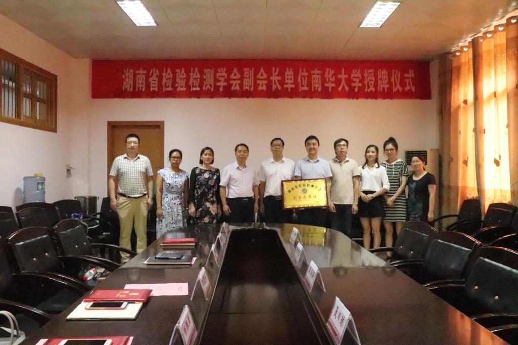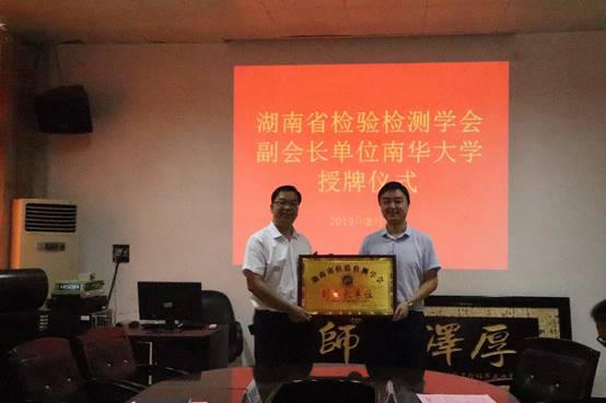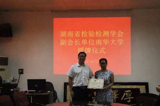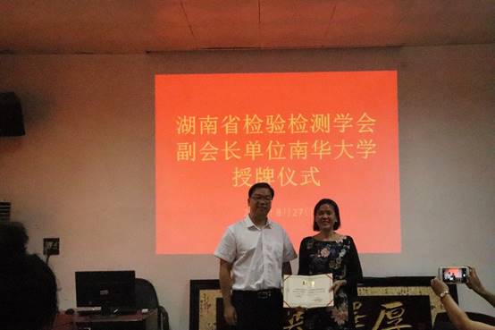 2019年8月27日上午,湖南省检验检测学会南华大学副会长单位授牌仪式在南华大学best365英国在线体育七教一楼学术报告厅举行。授牌仪式由南华大学best365英国在线体育院长龙鼎新主持,湖南省检验检测学会常务副会长兼秘书长陈祥光,湖南省检验检测创新联盟副秘书长欧庭蔚,湖南省检验检测学会秘书处李娜、聂日琼,南华大学best365英国在线体育副院长李乐、副院长杨慧仙、教学科研办主任于军晖、卫生检验与检疫系主任陈丽丽、卫生检验与检疫系支部书记杨胜园、预防医学实验中心支部书记刘金权以及学院从事卫生检验与检疫专业教学科研的相关教师参加了授牌仪式。