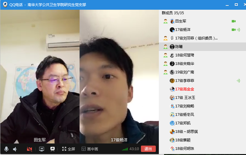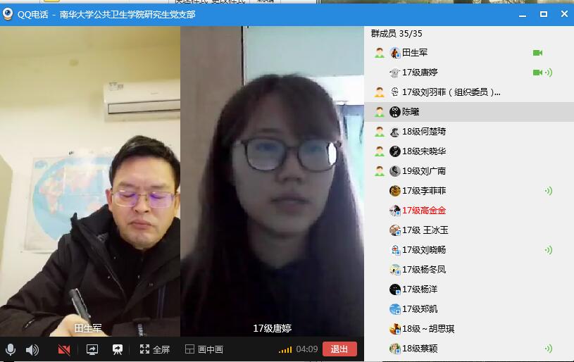 另外,其他党员也都表示将会牢记并遵守党中央以及学校的防控指示,将会更加努力学习自己的专业知识,希望可以在今后从事公共卫生事业工作中,尽自己所能去帮助更多的人,全心全意为人民的健康事业服务。最后,田书记进行了总结,他首先肯定了此次活动的顺利召开以及大家发言的积极性,内容丰富,收获颇多,希望大家会后将讲话全文更深入思考,认真领会习近平总书记的讲话精神,提高自己的认识和理解水平,争做一名有责任感、有担当、有专业思维和大局意识的“公卫人”,同时,强调党员干部要带头做好每天健康打卡工作,对于研一有网络课堂的同学要认真按照学校学院要求,在家认真完成学习,对于即将毕业的研三同学,在家里认真完成自己的毕业论文,及时关注线上的就业单位和招聘通知,特殊时期,对三会一课以及党日活动的召开要有计划,定时召开。