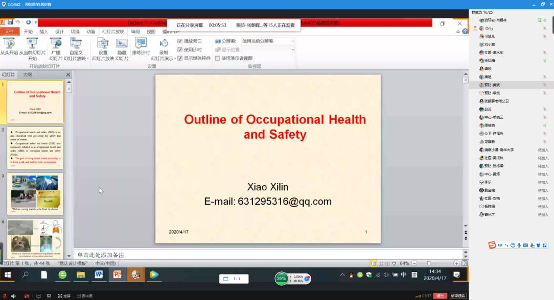 4月9日下午、4月17日下午组织全系老师通过QQ直播方式开展《预防医学L》教学预讲与研讨活动,并邀请了学院领导、学校和学院教学督导、学院其他系室有留学生教学经验的教师参加。肖锡林、单晓云、宋凤梅、刘小聪四位老师分别就《预防医学L》 “Outline of Occpational Health and Safety”“Nutrition and Hypertension”“Silicosis”“Heat Stress”等教学内容进行了线上预讲。参加活动的老师们针对预讲老师的课件、授课内容的编排、授课方式等方面进行了热烈的研讨与交流,经验分享与指导。龙鼎新院长还强调要注意国际学生与国内学生课堂互动积极性、主动性及参与方式方法的不同,并对年轻老师海外留学提出了希冀。