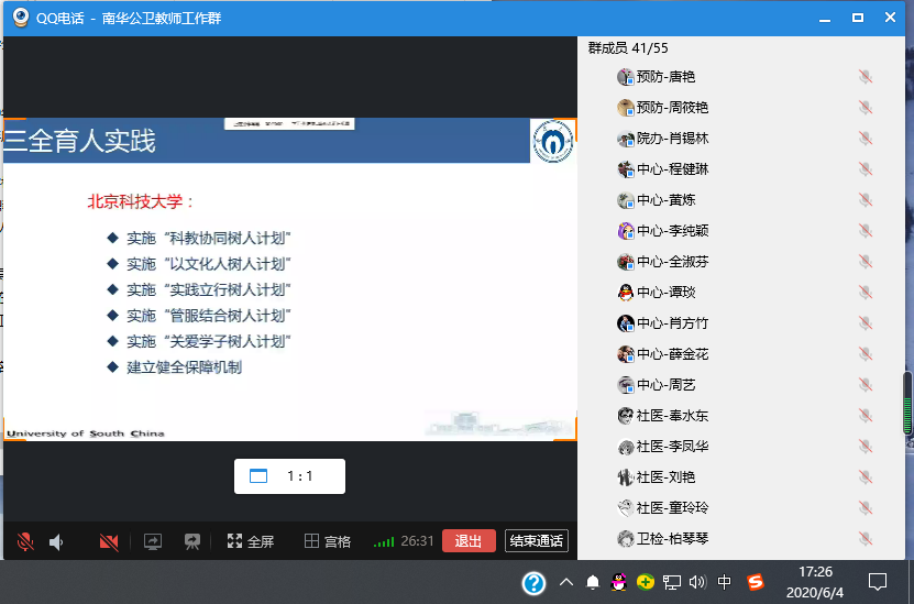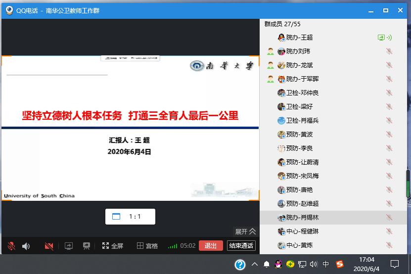 6月4日17:00院党委采用网络会议开展了南华大学2020年第三次教职工理论学习。围绕 “深入学习习近平总书记关于教育的重要论述,准确把握2020年全国、全省教育工作会议精神,深化本科教育教学改革,加强核心竞争力建设,提升“双一流”建设水平” 学习主题,全院职工认真领会学习2020年全国和全省教育工作会议精神。学习由院党委副书记王超主持。