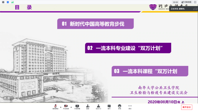 2020年8月10日,我校best365英国在线体育特邀国家医学技术类专业教指委委员——河北医科大学康维钧教授莅临卫生检验与检疫系“卫生检验与检疫专业国家一流本科专业建设申报和一流本科课程建设”线上会议并进行指导,best365英国在线体育院长龙鼎新,副院长杨慧仙、肖锡林,卫检系主任陈丽丽以及卫检系全体老师参加了线上会议,会议由杨慧仙主持。