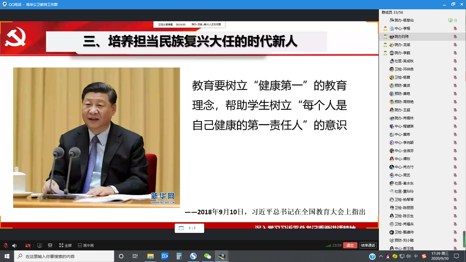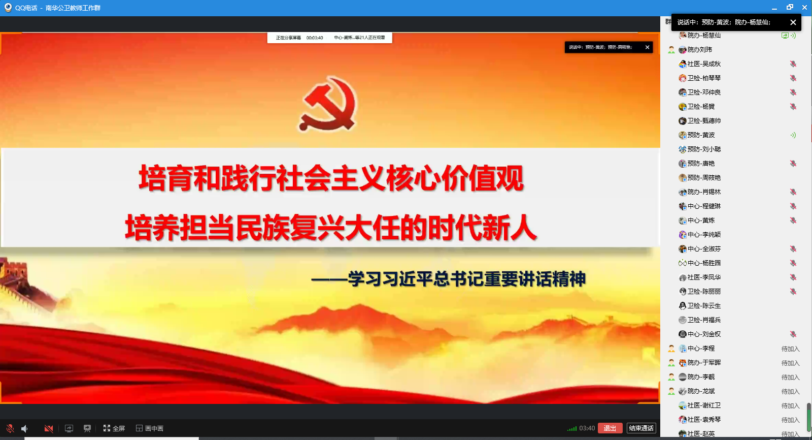 9月30日17:00院党委采用网络会议开展了南华大学2020年第五次教职工理论学习。围绕 “深入学习《习近平谈治国理政》第三卷,结合《习近平谈治国理政》第三卷的内容,深入领会习近平总书记关于社会主义核心价值观的重要论述,贯彻落实《新时代公民道德建设实施纲要》《新时代爱国主义教育实施纲要》,培育和践行社会主义核心价值观,传承和弘扬中华优秀传统文化,绘好爱国主义同心圆,不断增强中华民族的归属感、认同感、尊严感、荣誉感,培养担当民族复兴大任的时代新人” 学习主题,全院职工认真领会学习。学习由副院长杨慧仙主持。