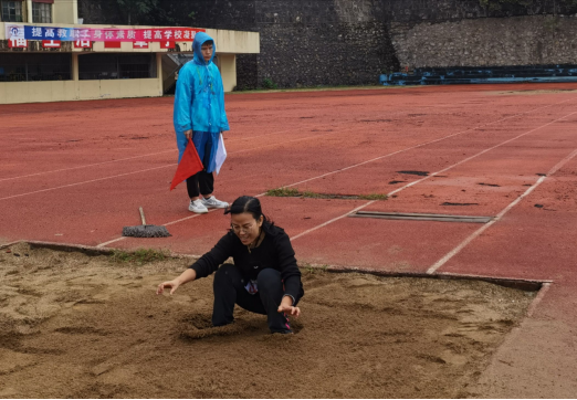 在16日下午的女子乙组跳远预决赛中。 “预备,开始跳!”只见唐艳老师弓着腰,双手紧握拳头,两眼盯着前方。突然,她猛地一甩头,迈开大步,一阵箭走如飞的狂跑,速度愈来愈快,一转眼就到达了踩板,猛地一跃,两腿向前伸展,在空中划出了一道弧线,落在了松软软的沙子里。这完美的跳跃是胜利的预兆,最终唐艳老师获得了教师组女子跳远比赛第七的好成绩!