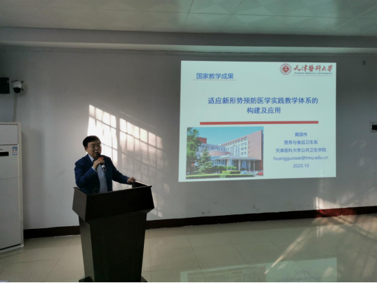 接着,黄教授作了两场报告:“适应新形势预防医学实践教学体系的构建与应用”和“膳食干预改善轻度认知障碍效果的研究”。第一场报告,黄教授以“健康中国2030”规划纲要强调坚持预防为主,推行健康文明生活方式的内容为导引,以国务院办公厅关于加快医学教育创新发展的指导意见为切入点,向参会人员介绍了天津医科大学近年来的教学改革后形成的医学实践教学体系和成果。第二场报告,黄教授立足于“轻度认知障碍(MCI)”和“阿尔兹海默病(AD)”的联系与AD在全球不容乐观的现状,阐述了“DASH饮食”和“MIND饮食”的具体内容,并介绍了研究中叶酸干预MCI的有效情况和相应的论文发表。在报告的尾声,黄教授还展示了天津医科大学的国际交流情况,鼓励在座的同学们继续深造学习。