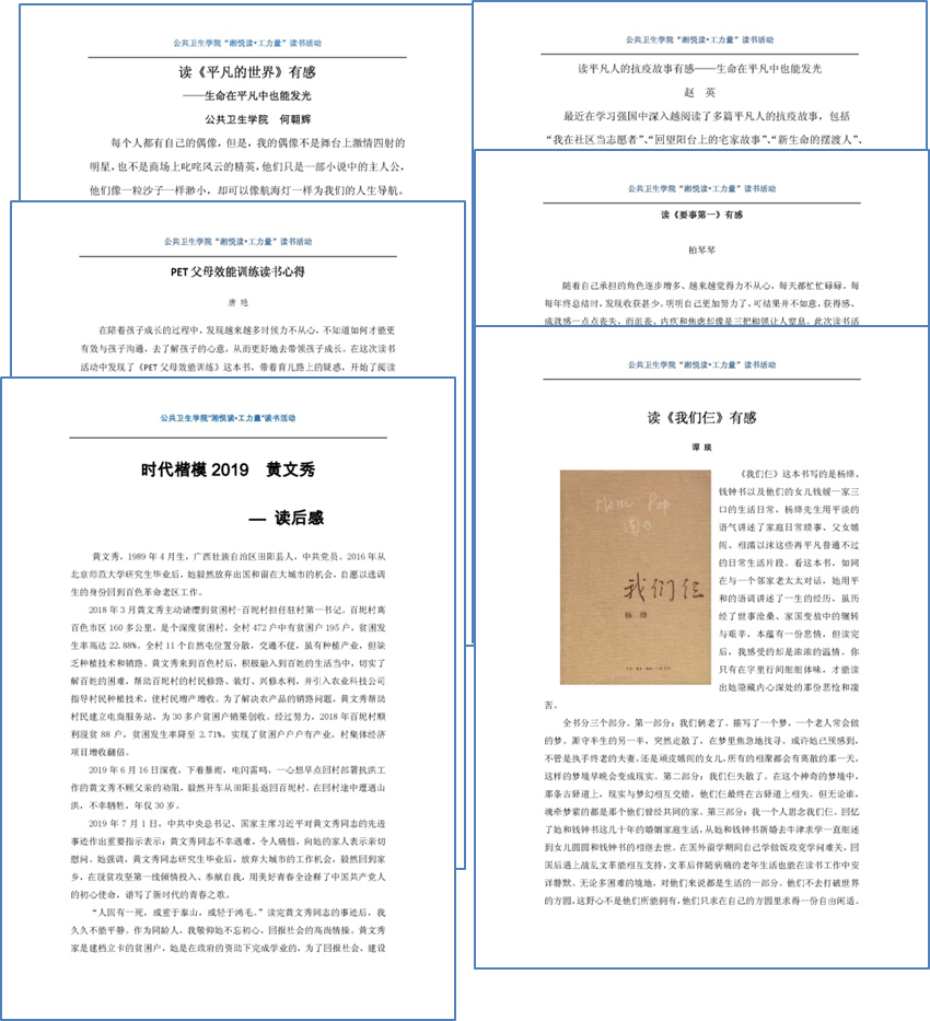2020年6月份开始,学院结合公共卫生专业特色分别以“读抗疫故事,做合格公卫人”;“ 聆听名人故事,弘扬奉献精神”;“ 合理膳食、提高免疫力”;“ 生命在平凡中也能发光”;“ 读科普,争做科普教育工作者”;“ 心灵发育,自我发展”作为每个月的阅读主题,采用线上线下相结合的方式,号召全体教职工积极参与阅读打卡。