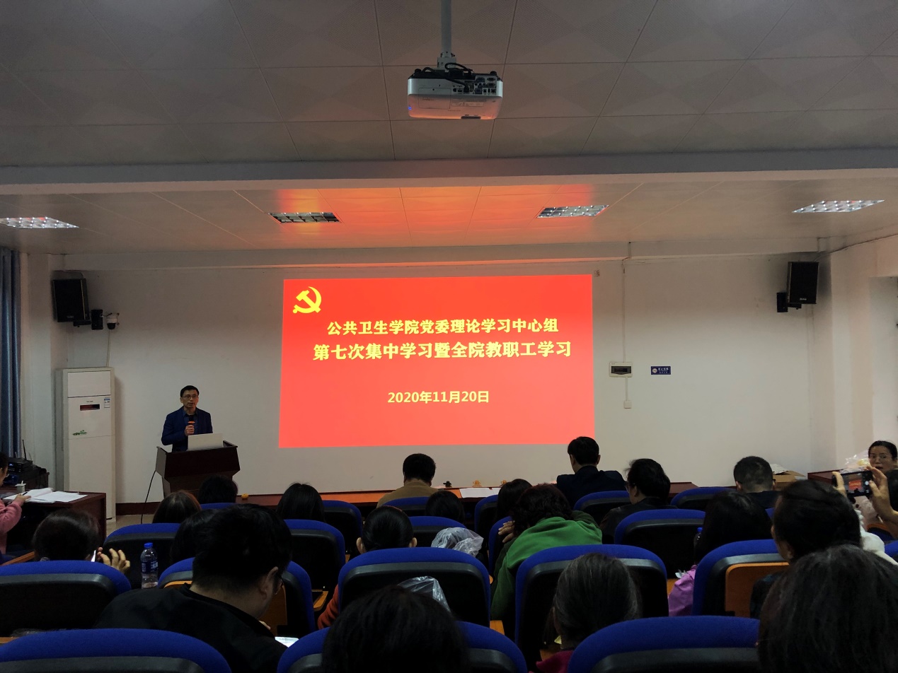 11月20日下午4点,全院教师在3教101会议室开展了南华大学2020年第七次教职工理论学习,围绕“深入学习党的十九届五中全会精神”专题进行研讨,会议由院党委书记张天成主持。院党委书记张天成领学了“中国共产党第十九届中央委员会第五次全体会议公报”和“习近平:关于《中共中央关于制定国民经济和社会发展第十四个五年规划和二〇三五年远景目标的建议》的说明”。各中心组成员和教师代表结合“全面推荐健康中国建设、完善全民健身公共服务体系”都进行了发言。最后张书记强调各位老师要坚持党的领导,深入学习《中共中央关于制定国民经济和社会发展第十四个五年规划和二〇三五年远景目标的建议》,特别是与医学事业发展和公共卫生专业发展有关的政策和目标,抓住新机遇,应对新挑战,依据学校的政策,创造学院新的发展局面,为培养出国家和社会需要的人才的努力。