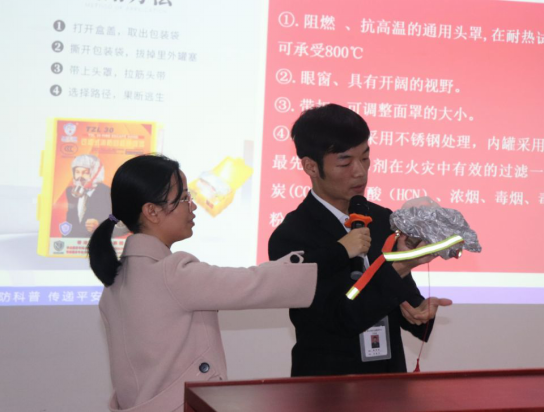 然后,蒋老师为大家现场示范消防面具的使用方法和干粉灭火器的使用流程,以及介绍新型烟雾警报器如何提醒火情发生。并提出“预防为主,防消结合”的指导方针。
