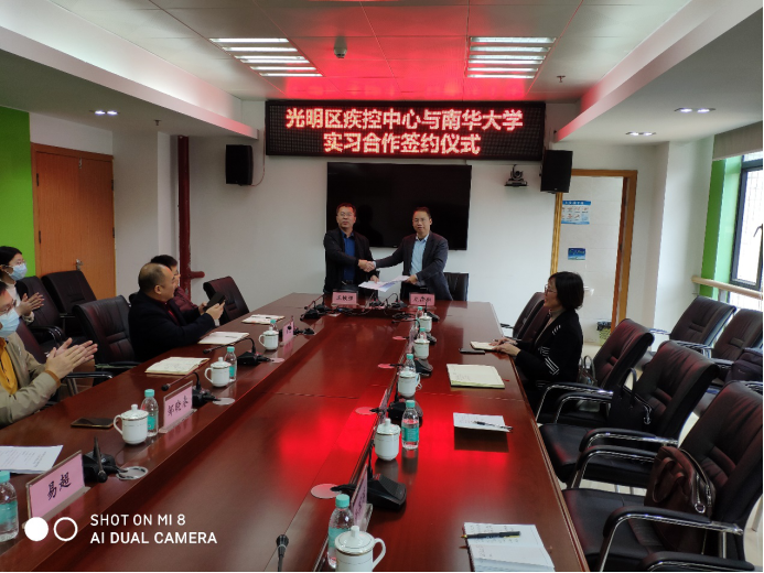 随后,龙鼎新院长一行又赶往深圳市光明区疾病预防控制中心签订教学实习协议。光明区疾控参加本次签约仪式的有中心主任王铁强、副主任邹晓春、副主任刘义、副主任易超等。本次签约仪式由易超副主任主持,双方就建立公共卫生实习教学基地,开展预防医学专业学生实习合作等方面进行了亲切友好的交流,达成了合作协议。最后由龙鼎新院长和王铁强主任分别代表单位签订了南华大学公共卫生教学实习基地协议书。