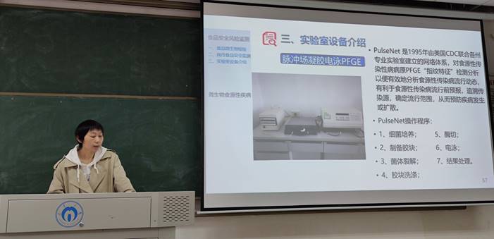 授课过程中,颜淑妩老师从食品样品采集原则,食品中存在的各种病原体,包括病毒、细菌、真菌、寄生虫,以及各病原体检测方法和限值分别详细讲解。然后,给同学们普及了分子溯源方法的优越性及重要性,同时简单介绍了衡阳市自2015年-2020年各类食品卫生监测结果,最后讲授了用于食品微生物检测的主要仪器设备。