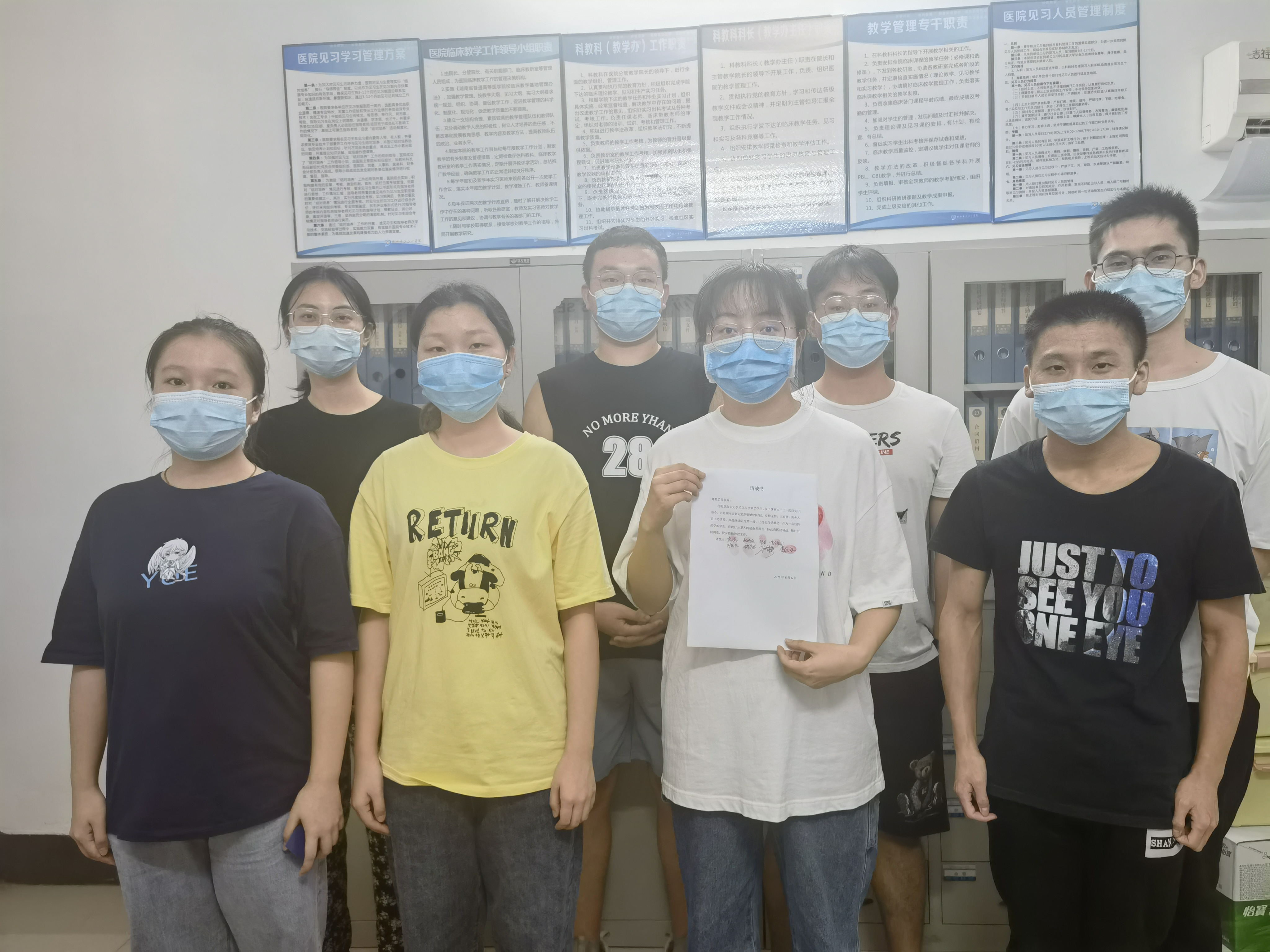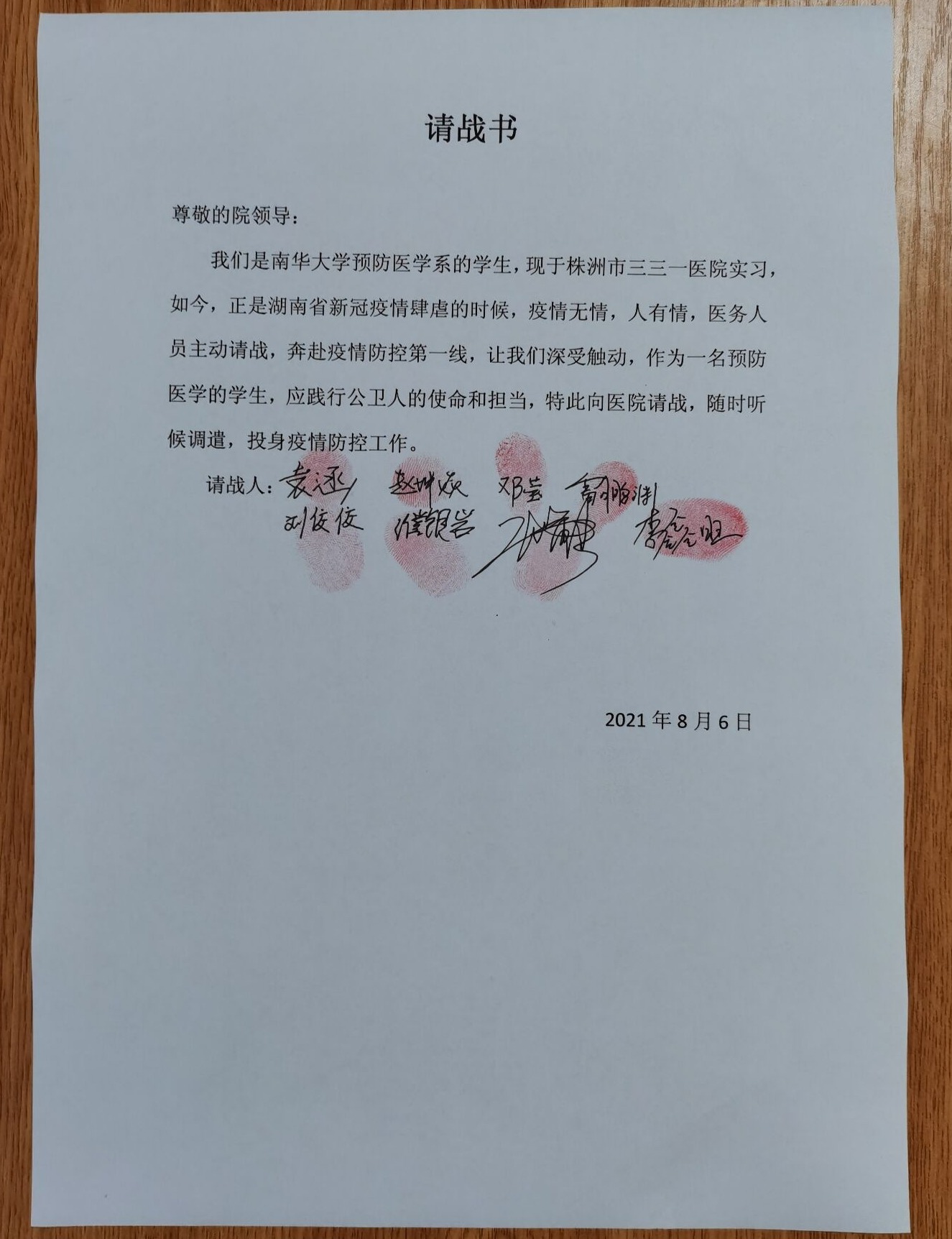 “我们是南华大学预防医学系的学生,现于株洲市三三一医院实习,如今,正是湖南省新冠疫情肆虐的时候,疫情无情,人有情,医务人员主动请战,奔赴疫情防控第一线,让我们深受触动,作为一名预防医学的学生,应践行公卫人的使命和担当,特此向医院请战,随时听候调遣,投身疫情防控工作。”
