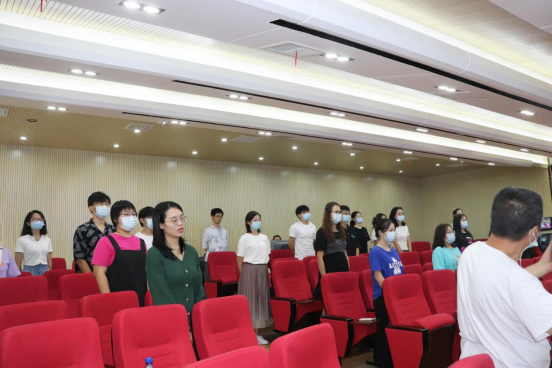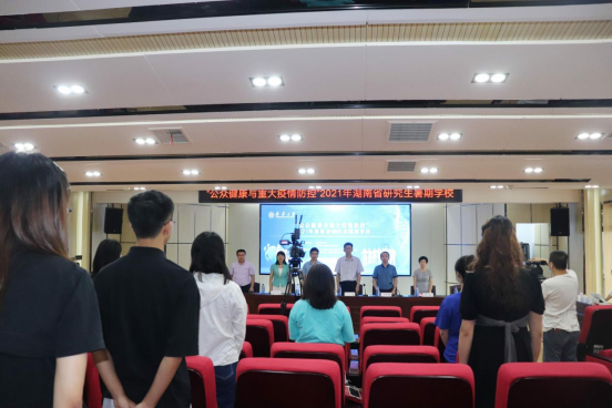会议第五项,龙鼎新作总结讲话。龙鼎新对本次暑期学校中的工作进行了全面总结,并对支持和帮助筹备本次暑期学校的单位和领导表示感谢,同时也感谢各位专家的精彩报告,感谢老师们和同学们的辛苦付出。正是因为大家的共同努力,本次暑期学校活动得以顺利落幕。会议第六项,全体起立,奏唱校歌。最后,张天成书记宣布2021年湖南省“公众健康与重大疫情防控”研究生暑期学校圆满结束。