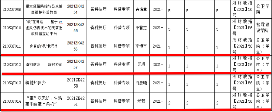 为加快科研成果的转化与推广应用,我院积极参与湖南省科技厅创新项目。在湖南省第九批创新型省份建设专项项目中,best365英国在线体育吴瑕同学的项目“请相信我——新冠疫苗”、李博宇同学的项目“你真的‘氡’我吗?”以及米懿同学的项目“‘蛋’吃无妨,生鸡蛋里暗藏‘杀机’”获得立项资助,成为我校首批获该项目资助的学生。他们为学院赢得了荣誉。
