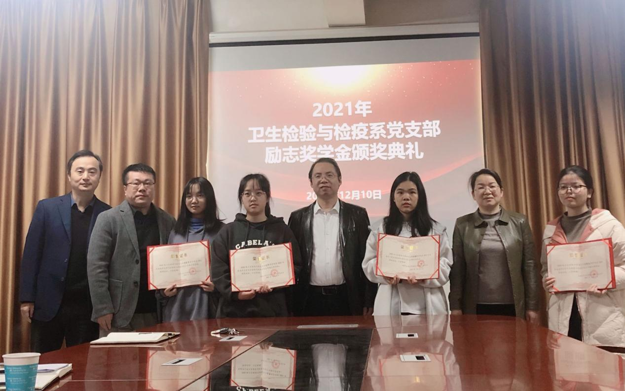 随后,邓仲良介绍了本次励志奖学金设立的初衷和评选办法。卫生检验与检疫系党支部践行“学党史、悟思想、办实事、开新局” 主题教育精神,以实际行动关心关爱学生,让学生体会到师生情谊、组织之暖和集体之爱,特此设立励志奖学金资助品学兼优的经济困难学生,并公布了四位获奖同学名单,他们分别是20卫检01班钟慧媚同学、20卫检01班胡慧琪同学、20卫检02班刘爱华同学、20卫检03班吴烨同学。我院领导给获奖同学进行了颁奖并合影留念。