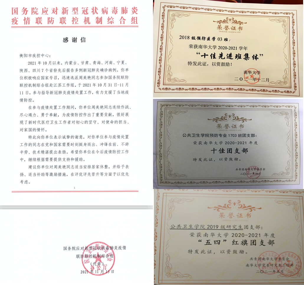 广大公卫学子自强不息,奋勇争先,取得了一系列的优异成绩。18预防03班获得了“校十佳班集体”荣誉称号,17预防03班获得了“校十佳团支部”荣誉称号,2019级研究生团支部获得了“校五四红旗团支部”荣誉称号,营养科普团队与辐射神经毒理创新团队获得了“校十佳大学生创新团队”荣誉称号。周美艳志愿请战,英勇抗疫,收到了来自国务院的表扬信;本科生吴瑕、米懿,研究生生胡聪聪、陈磊(学)、陈磊(专)获得了国家奖学金,李映梅等11名本科生获得“湖南省优秀毕业生”荣誉称号,宋晓华获得“湖南省优秀研究生毕业生”荣誉称号;王琪获得“最美大学生”提名,单小熙获得“校十佳共青团干部”荣誉称号,努尔扎提·艾合买提获得“校十佳青年志愿者”荣誉称号,张琼获得“校十佳创新创业先锋”荣誉称号,徐杰茹获得校“十佳研究生团员”荣誉称号。我院学子在南华大学第十一届预防医学技能大赛斩获多项奖励;在湖南省科技厅2021年度第九批创新型省份建设专项项目中立项3项;大创立项国家级6项,省级16项。我院学子在校篮球赛与校啦啦操大赛中收获奖牌!
