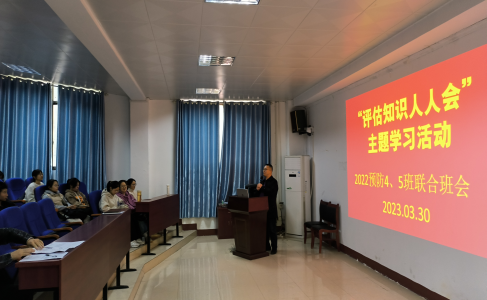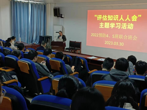 2023年3月30号下午,为营造“人人关心评估、人人了解评估、人人参与评估、人人都是评估对象”的浓厚氛围,进一步推进本科教育教学审核评估工作,best365英国在线体育2022级预防04班、05班在3-101教室联合举行了“评估知识人人会”主题学习联合班会。学院党委书记、2022级预防04班班主任龙鼎新老师、学院副院长、2022级预防05班班主任张朝晖老师出席会议。龙鼎新主持会议。