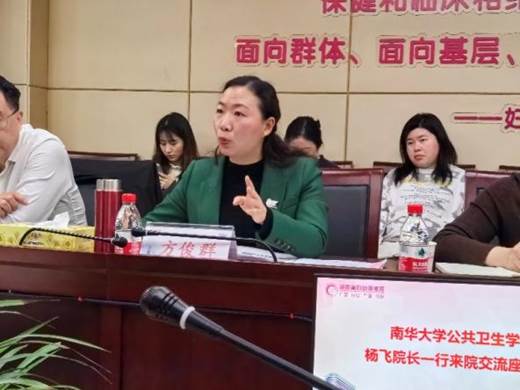 双方就科研与学科建设合作思路、揭榜挂帅等重大项目联合申报与推进、研究生联合培养等方面进行了交流与探讨,均表达了在科研与学科建设合作、科研项目申报和人才培养等方面深度合作的强烈意愿。同时,杨飞院长就学生就业工作与妇幼保健医院进行了深入交流,详细了解了单位的用人需求,并邀请该单位来校选聘优秀毕业生。刘景诗院长表示,附属妇幼保健院将与南华大学在科研与学科建设合作和人才培养方面紧密合作,通过共同申报科研项目,开展联合研究,促进学术成果的共享,促进学科发展。