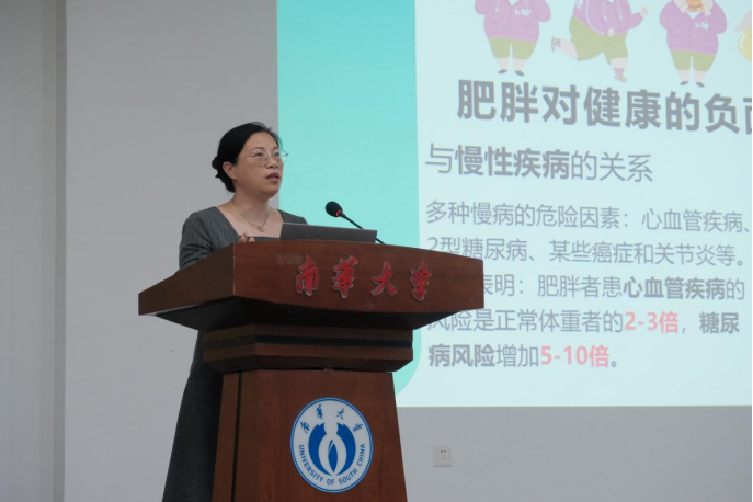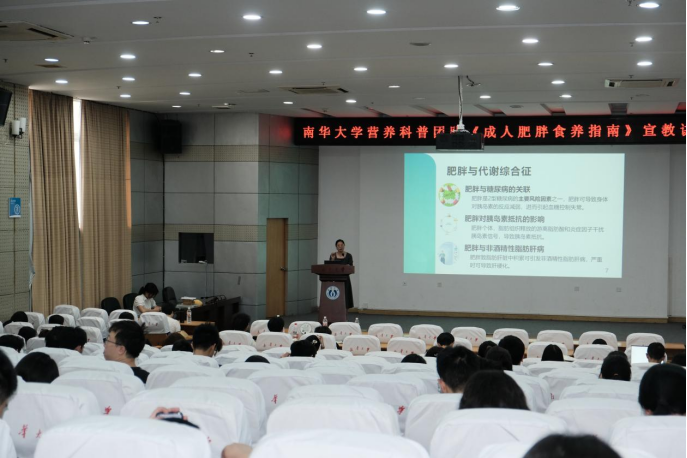 2025年5月17日下午,南华大学2025年全民营养周核心活动——《成人肥胖食养指南(2024版)》专题宣教讲座在红湘校区新知学堂隆重举行。活动由best365英国在线体育营养与食品卫生学教研室主任周筱艳副教授担纲主讲,近200名师生齐聚一堂,共同探索肥胖防控的科学路径。