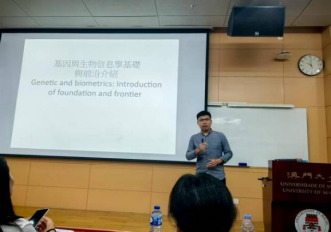 欢迎仪式结束后,澳门大学健康科学学院黄冠豪教授给同学们作“基因与生物信息学基础与前沿介绍”专题讲座,同学们认真听讲,积极用英语与黄冠豪教授互动,回答他所提出的问题。