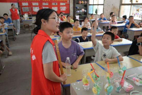 海姆立克急救法的原理是利用肺部残留气体形成人工咳嗽,通过外力冲击腹部,迫使膈肌上升,压缩肺部空气,从而冲出阻塞气道的异物。志愿队员陈同学以瓶子模拟胸廓、吸管当作气管、气球代表肺和膈肌,带领孩子们分组动手搭建呼吸系统模型,认识肺部结构。通过亲手实践,孩子们理解了呼吸原理。制作过程中,一组小朋友不慎弄破了充当膈肌的气球膜,这个小意外反而成为生动的教学案例——陈同学借此深入讲解了膈肌的重要作用,让孩子们深刻记住了海姆立克急救法的关键。