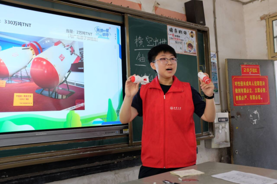 最令人动容的莫过于课堂外的温暖瞬间。五年级男生小严本就对原子弹知识很感兴趣,课堂上每次提问都能快速举手,回答准确又流畅。下课后,他抱着笔记本特意找到宣讲队员,眼神里闪烁着对知识的热爱与对国家的关切。“我以后想参军入伍,当特种兵守护国家!”当孩子说出这句心里话时,在场的队员们深切感受到,榜样精神正在悄然传递。
