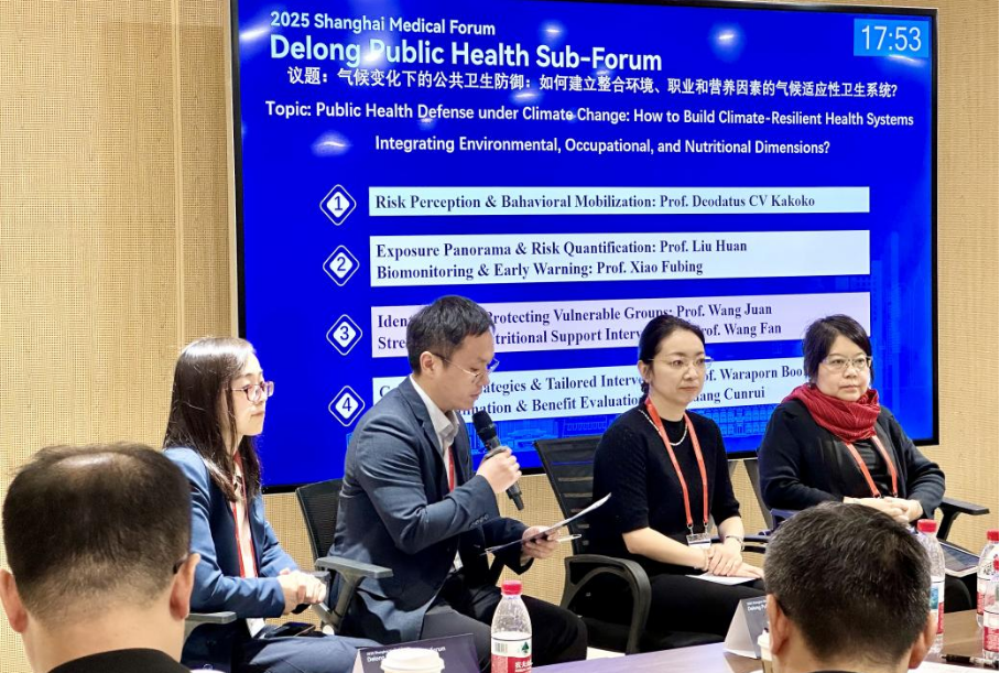 在圆桌讨论环节,肖福兵副院长就“如何建立整合环境、职业和营养因素的气候适应性卫生系统”发表见解。他指出,气候变化所带来的复合型健康威胁日益严峻,高温与污染等因素的叠加效应远大于单一因素。他提出,可借鉴生物剂量学理念,推动三大转变——从环境监测转向人体监测,从单一指标转向复合‘分子指纹’,从延迟报告转向实时干预,并融合可穿戴设备、多组学分析与人工智能等前沿技术,构建新一代监测预警与主动干预体系,从而实现公共卫生从被动应对到精准预测的战略转型。