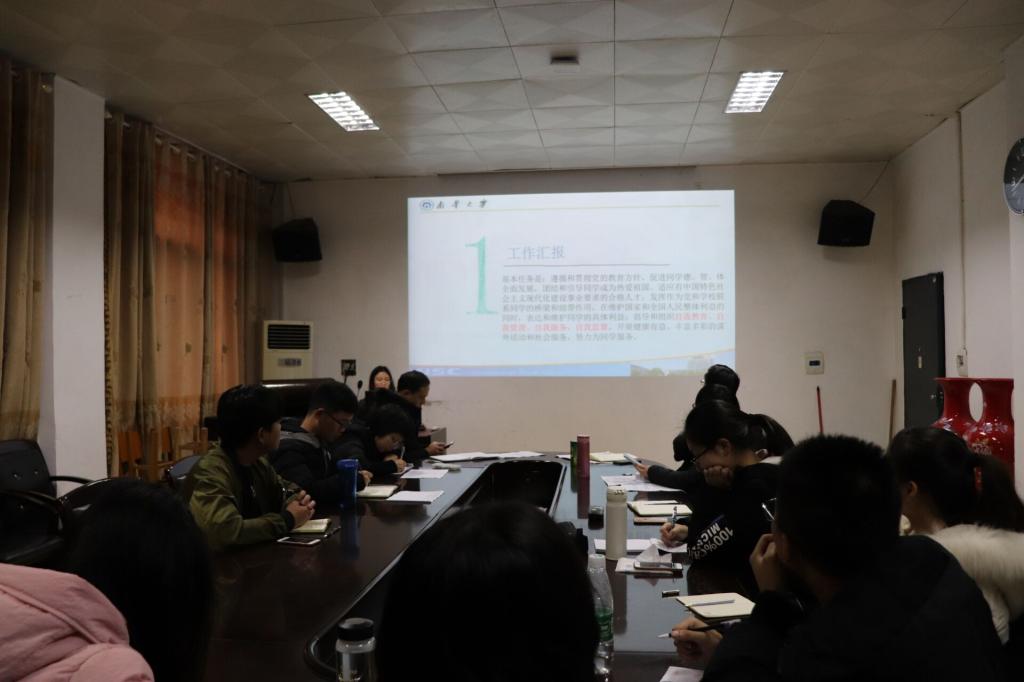 本次会议分为四个阶段。第一阶段,由院学生会主席胡静作院学生会分会述职报告。报告从工作汇报、工作困难、工作展望三个方面对我院2018年的学生会工作做全面的总结。紧接着,院团委副书记邱阳介绍了我院团委2019年的工作思路,并提出了新学期的一些设想,譬如增设社会实践部,实现与校级部门对接,以及动员学院全体学生进行志愿服务活动。随后,院学社联主席马冰蟾就院学社联2019年的工作计划进行了简要汇报。