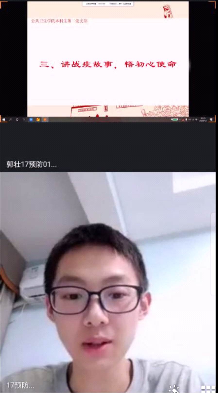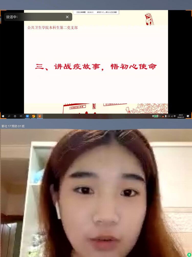第二阶段是集体讨论。支部党员同志轮流分享身边的战疫故事,抒发自己的心得体会。17级卫检01班周夏雨和17预防02班单小熙对此深有体会。他们主动报名参与疫情期间的社区志愿者服务,在社区抗疫一线工作、24h轮流值班,重复着简单却必要的体温测量工作,反复进行着新冠疫情科普,保障小区安全。当有人问及他们为什么报名,他们说作为党员,在举国上下齐心参与抗疫战争时,没有那么多缘由,仅仅是要为人民群众做事,要将服务人民的行动落实。这两位优秀志愿者充分发挥了党员的先锋模范作用,践行了全心全意为人民服务的宗旨,值得支部所有学生党员学习。