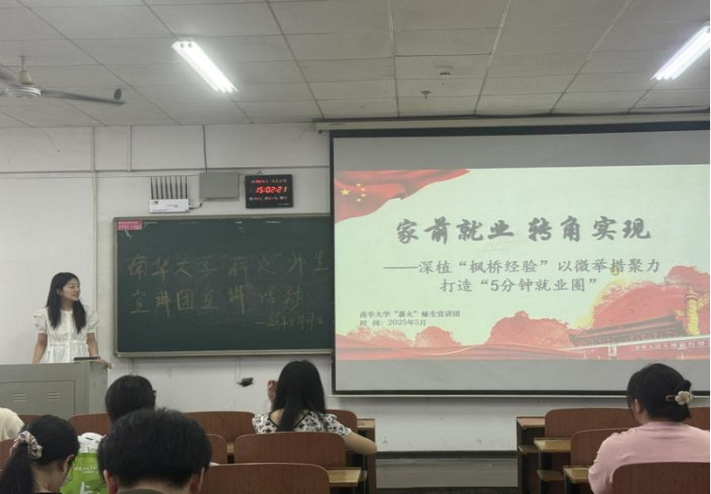 宣讲会上,宣讲团成员贾蕊以“基本民生保障” 为切入点,系统解读了我国就业优先政策体系。她结合全国就业保障创新实践案例,重点介绍了衡阳市“就业服务驿站”建设经验,生动阐释了新时代“枫桥经验”在基层就业服务中的创新运用——通过社区微治理、精准化服务,打造“5 分钟就业圈”,让高校毕业生在家门口实现就业创业。“就业是最大的民生,党和国家始终将稳就业、保就业作为重中之重。” 贾蕊的讲解深入浅出,既传递了政策温度,又展现了基层治理的智慧,让在场学子深刻认识到就业政策与公共卫生事业的紧密关联。