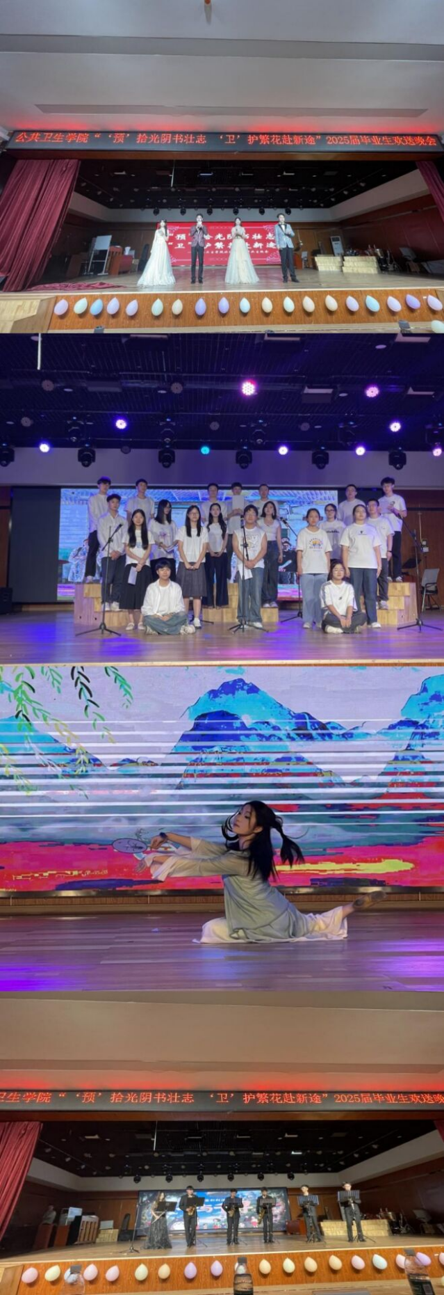 随后的晚会节目精彩纷呈,高潮迭起,深情演绎了公卫学子的青春风采与同窗情谊。一曲《凤凰花开的路口》串联起五年校园生活的点滴记忆;《if i ain't got you》凭借扎实的唱功赢得满堂喝彩;温暖声线演绎的《裹着心的光》传递出对同窗最真挚的祝福。诗朗诵《永不褪色的日子》配合大屏幕上闪过的熟悉校园场景,瞬间唤起集体记忆,将晚会推向首个情感高潮。魔术表演《当下此刻》以变幻莫测的手法令观众叹为观止;独舞《醉清波》以曼妙舞姿尽显东方神韵;乐器合奏《千与千寻》则用灵动的音符编织出一幅动人的青春画卷。《稻香》的旋律一出,便引发全场大合唱,气氛温馨热烈。 当毕业班联合出品的大合唱《纪念》响起,“我只想要拉住流年,好好地说声再见”的歌声中,现场许多人眼中泛起泪光,满是对校园生活的深深眷恋与不舍。 晚会的压轴节目——光影戏《不说再见》,以独特的光影艺术手法,生动再现了从入学军训到毕业答辩的珍贵成长历程。熟悉的校园场景如电影般一帧帧呈现,将晚会气氛推向最高潮,为青春时光画上了一个充满创意的句点。