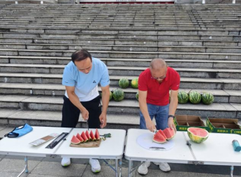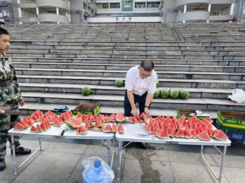 慰问活动现场温情满满。曾志伟副书记和张朝晖副院长亲自将一个个饱满的西瓜切分成整齐的小块。他们一边熟练地切着西瓜,一边与身旁等待的同学们亲切交谈,询问他们“训练累不累?”“生活习不习惯?”,言语间充满了关切。随后,两位老师将一块块清甜多汁的西瓜亲手递到同学们手中。