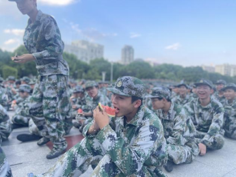 “同学,辛苦了,快来吃块西瓜解解暑!”“训练要注意补充水分,照顾好自己。”一句句暖心的话语,伴随着甘甜的西瓜,丝丝清凉沁入心脾,瞬间驱散了同学们连日训练的疲惫与秋日的燥热。手捧这份意外的“清凉礼物”,同学们脸上洋溢着惊喜与感动的笑容,训练场上一时间充满了欢声笑语。