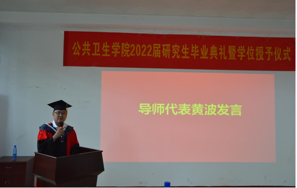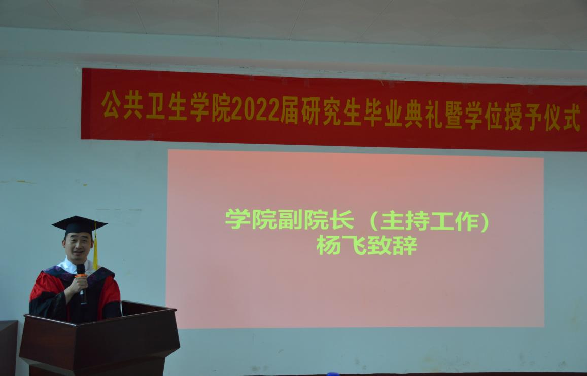 最后,杨飞致辞。他向顺利毕业的学生与各位辛勤付出的导师表示祝贺与感谢。他回顾了三年来2022届研究生毕业生取得的成绩,并对学生寄语希望。他希望学生们在今后要以德修身,勇担使命,做一个懂感恩、知孝道、讲诚信、有担当的人;要仰望星空,坚持梦想,笃学实干,努力坚持自己的梦想,一步一个脚印脚踏实地往前走;要敢为人先,不断学习和创新,积极投身到健康中国建设和维护世界公共卫生安全的伟大事业中去,成就自我、筑梦未来。