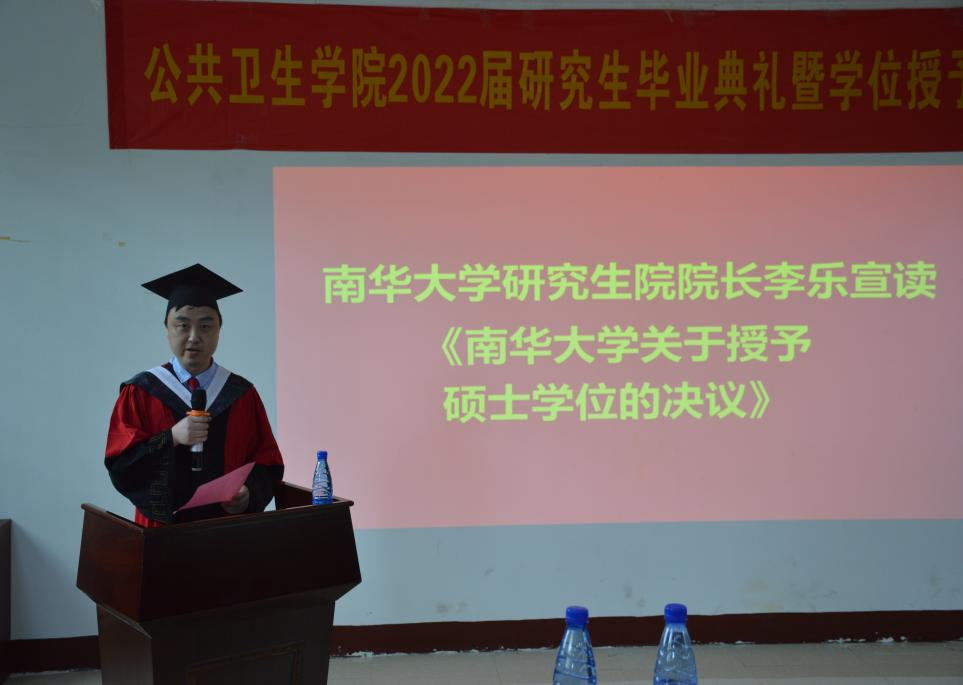 首先,全体起立,奏唱国歌。典礼在雄伟激昂的国歌声中拉开了序幕,研究生院院长李乐宣读了《南华大学关于授予硕士学位的决议》,宣布陈磊等37名研究生取得硕士学位。