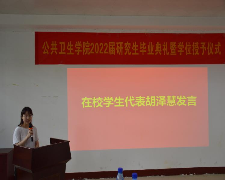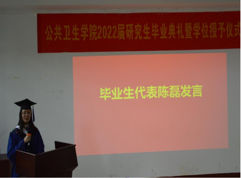 随后,毕业生代表陈磊,在校学生代表胡泽慧发言。陈磊回望研究生3年披星戴月的拼搏时光,南华有太多深情镌刻的记忆,这些都将成为人生旅途弥足珍贵的牵挂和陪伴。陈磊表示,她们一定会坚守公卫人的使命,为祖国的现代化事业贡献出自己的力量。胡泽慧向2022届顺利完成学业的师兄师姐们,表示了最热烈的祝贺和最真挚的祝福,同时也对师兄师姐们两年来帮助表示感谢。并表示定将传承best365英国在线体育的精神,从容面对未来科研生活,带好下一届师弟师妹。