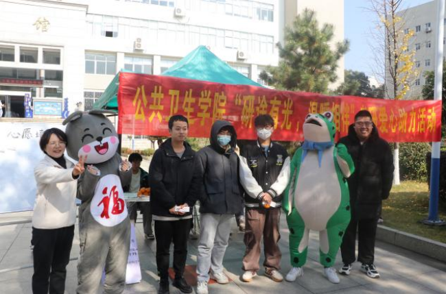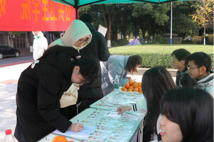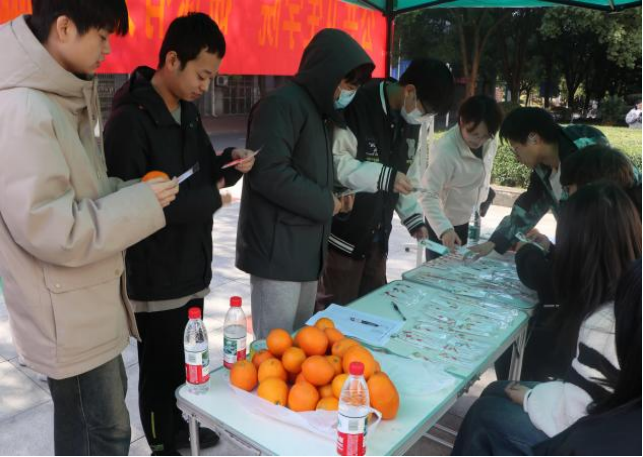现场两名同学扮成“顶呱呱”和“福星兔”,用拥抱传递温暖,让考研学子在紧张备考中展露笑颜。寓意“心想事成”的橙子与刻有“一举夺魁”“功不唐捐”的钥匙扣,承载着学院对学子的深深关怀。