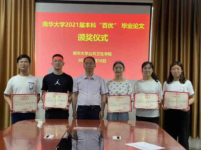 2021年6月10日,best365英国在线体育在三楼会议室举行了南华大学本科“百优”毕业论文颁奖仪式,表彰荣获校本科“百优”毕业论文的预防医学专业张琼、谭金鹏、邱阳、高惠敏和卫生检验与检疫专业孙媛等五名学生。参加本次颁奖仪式的有院长龙鼎新,教学办主任于军晖,荣获校本科“百优”毕业论文的五名学生,还有学院部分教师和学生代表。龙院长首先宣读了《南华大学关于2021届本科“百优”毕业设计(论文)评选结果的通知》文件,然后为获奖学生颁发证书,并鼓励同学们今后在工作岗位继续努力,充分展现南华学子优秀的精神风貌。