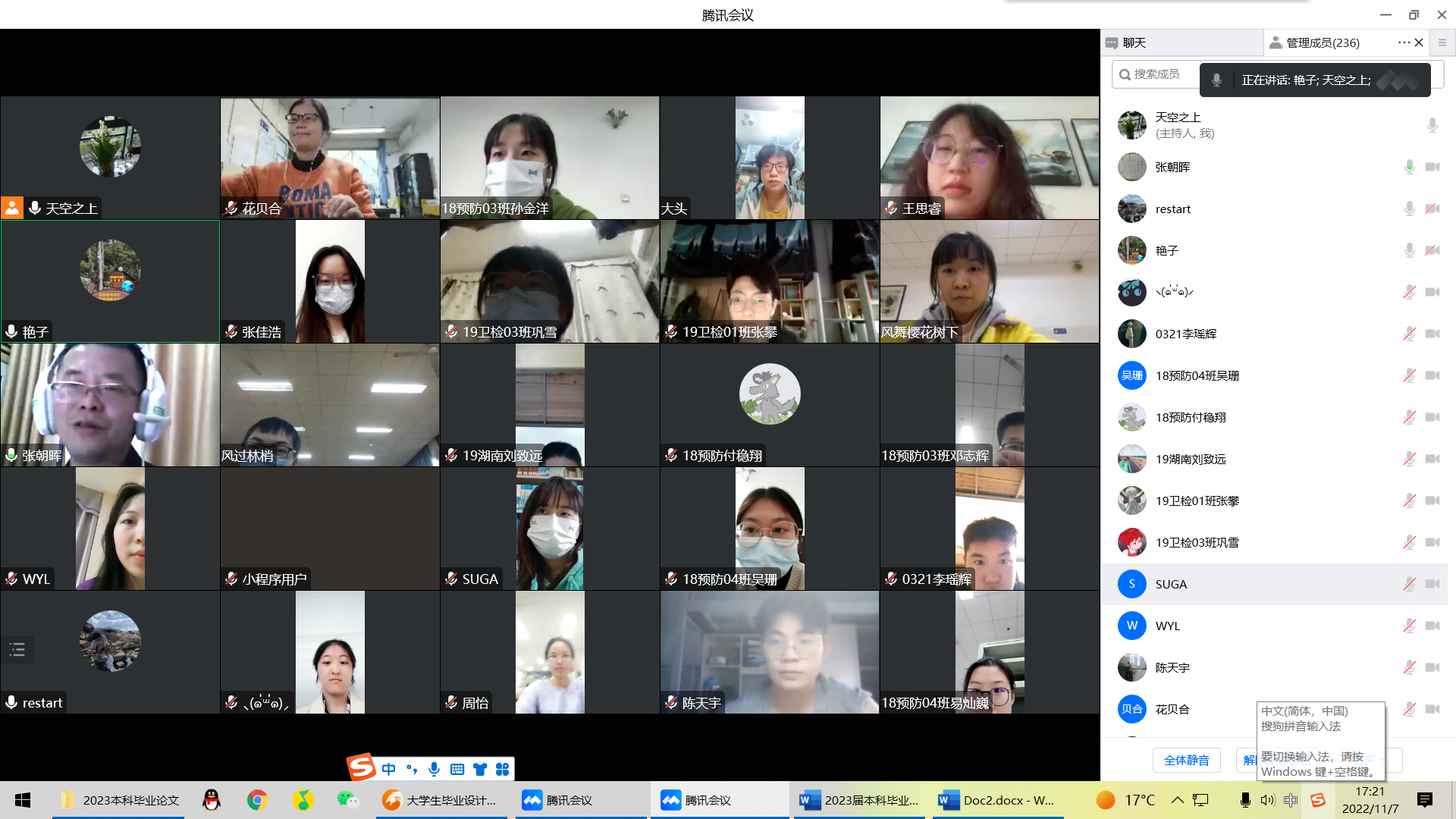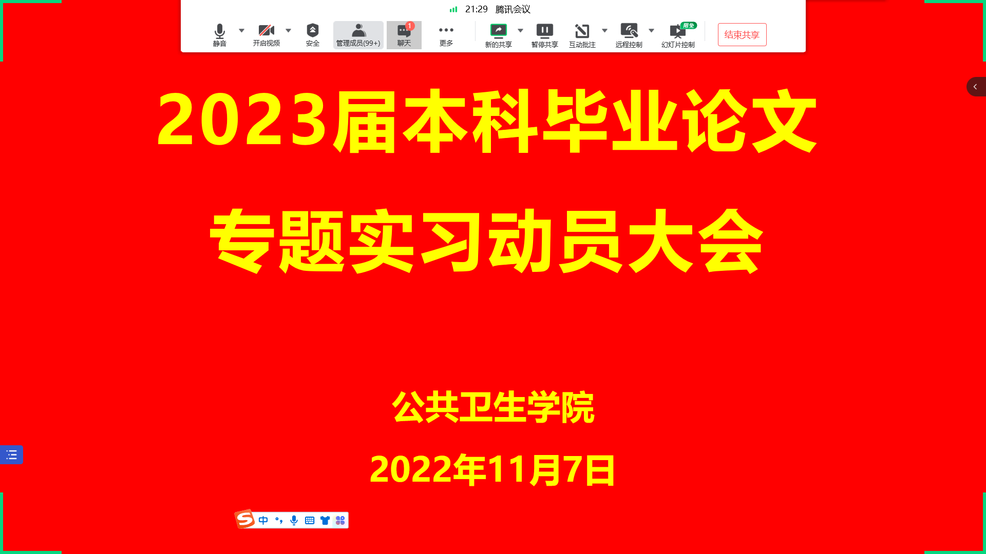 为进一步提升我院教学质量,强化学术诚信教育,加强教学管理,best365英国在线体育开展了专题实习教育,于2022年11月7日下午通过腾讯会议在线召开了2023届本科毕业论文动员大会。本次会议由教学办主任于军晖主持,参加会议的有学院副院长张朝晖老师、实验中心主任杨胜园老师、预防医学系副主任周筱艳老师、卫生检验与检疫系副主任柏琴琴老师、学工办辅导员何朝辉老师,2018级预防医学专业全体学生、2019级卫生检验与检疫专业全体学生、船山学院2018级预防医学专业全体学生。