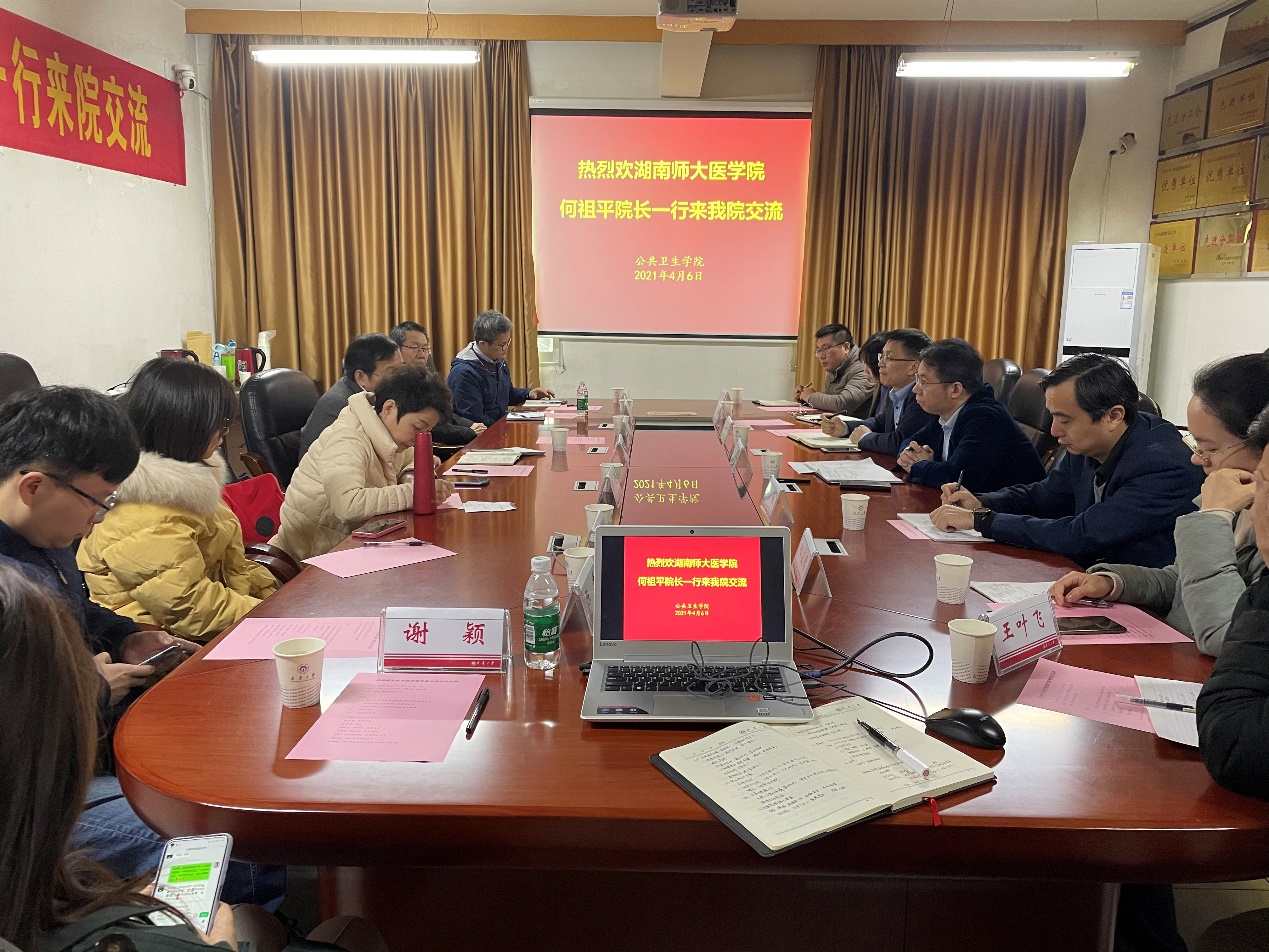张天成致欢迎辞,双方介绍了参会人员。龙鼎新从学院的基本情况,取得的成效以及发展的亮点,机遇和面临的挑战以及学院的发展思路和举措等四个方面介绍了学院发展情况,何祖平院长介绍了湖南师范大学预防医学系的发展情况,并对南华大学在公共卫生取得的优异成绩给与了高度赞扬。随后双方就我院“十四五”建设规划,机构设置、管理运行模式及规章制度,人才培养模式等方面进行了深入探讨,就研究生培养、社会医学与卫生事业管理和卫生检验发展、健康科普等问题进行了经验分享和交流。