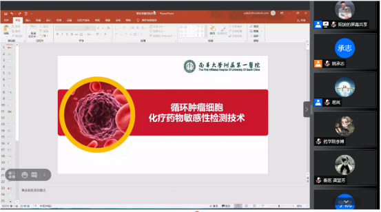 下午16:30,开始了当天的第四场讲座。本场讲座邀请到南华大学附属第一医院药学部主任阳波教授,易岚教授主持讲座。阳教授作了题为“肿瘤细胞化疗药物敏感性检测技术”的专题讲座。阳教授首先比较了肿瘤在世界范围内的患病现状,随后介绍了化疗药物治疗方案及两大障碍,CTC的应用、需攻克的两大难点及其发展史的重要事件。讲座结束后学员反响热烈,阳教授针对学员的提问一一解答,使师生收益颇丰。