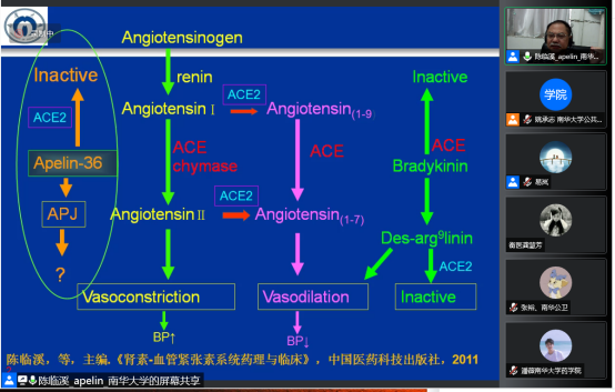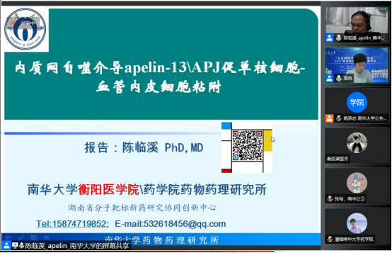 上午10:00,开始了当天的第二场讲座。本场讲座邀请到南华大学陈临溪教授,陈教授为大家呈现了一场题目为“内质网自噬介导apelin-13\APJ促单核细胞-血管内皮细胞粘附”的精彩讲座,易岚教授主持讲座。陈教授首先介绍了自己的研究领域和方向,接下来详细介绍了Apelin/APJ的历史研究进展及其定义、生理、病理作用,分享了课题组近期研究。讲座结束后学员反响热烈,陈教授针对学员提出的问题进行了答疑,为学员未来的研究方向、学科交叉学习提供了宝贵的建议。