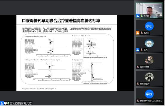 下午15:00,迎来了第三场讲座。本场讲座邀请到南华大学附属长沙中心医院药学部副主任兼教研室主任高利臣教授,他为大家呈现了一场题目为“中国成人2型糖尿病口服降糖药联合治疗专家共识”的精彩讲座,易岚教授主持讲座。高教授首先介绍了糖尿病的病理生理机制,单一药物无法维持血糖长期达标,口服降糖药早期联合治疗显著提高血糖达标率,随后解读了目前上市的7大类口服降糖药的作用特点及口服降糖药联合治疗遵循原则。在讲座的最后,学员们就讲座内容积极提出问题,高教授对学员们的问题进行了网上答疑,使学员们收益匪浅。