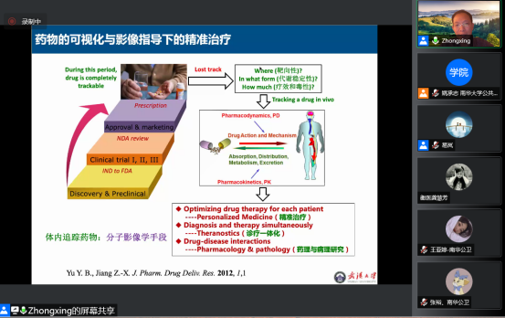 上午8:30,开始了当天第一场讲座。武汉大学药学院江中兴教授作了题为“氟-19磁共振成像在药物可视化中的应用”的专题讲座。本场讲座由药学院副院长易岚教授主持。江教授首先介绍了氟-19磁共振成像的定义及应用,而后比较了氢-1磁共振成像与氟-19磁共振成像的优缺点,通过举例说明氟-19磁共振细胞追踪,解读了氟-19磁共振在药物可视化中的挑战及氟-19磁共振应用于药物可视化的策略。讲座结束以后学员们积极提问,江教授针对学员的提问一一解答,使师生收益颇丰。