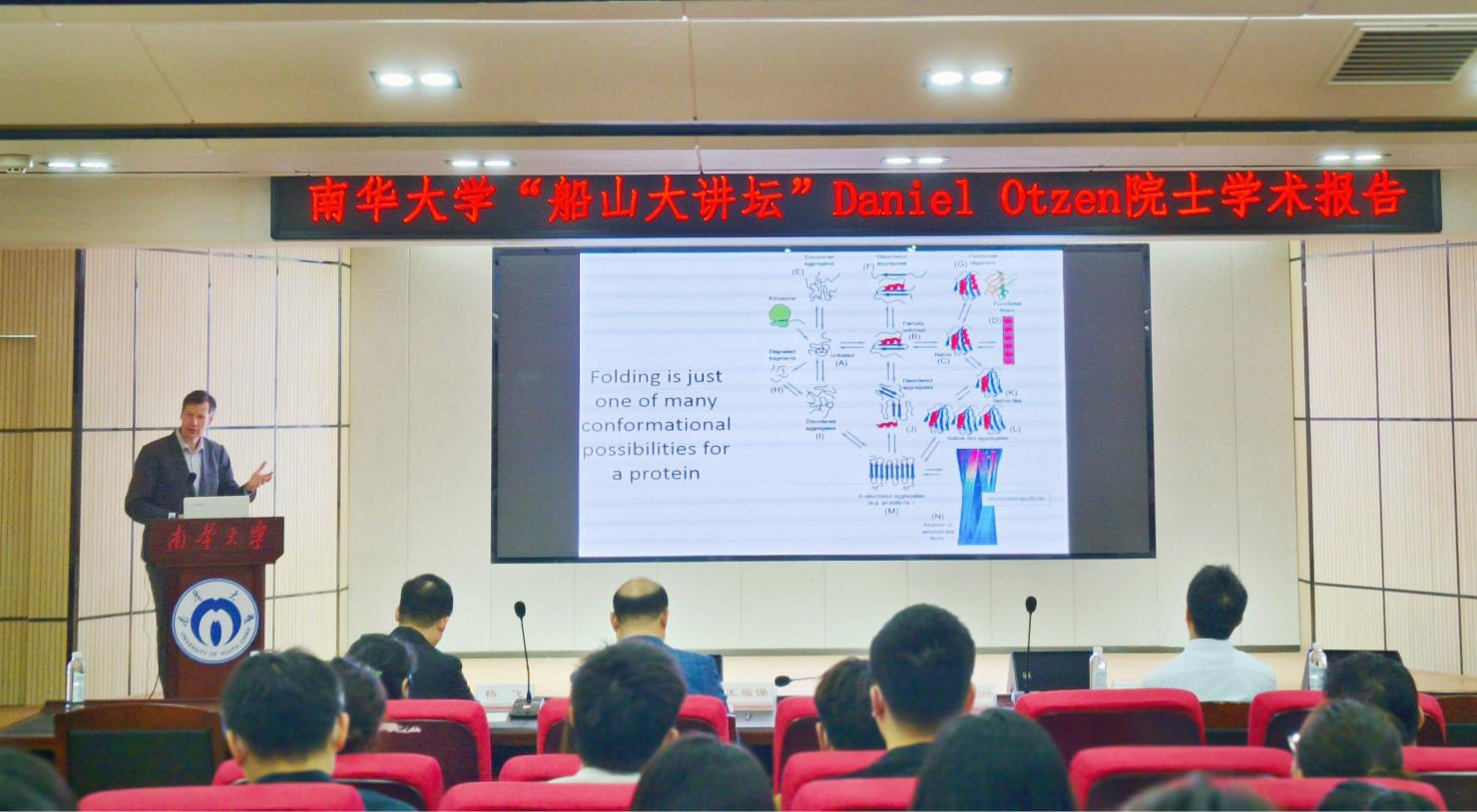 近日,南华大学best365英国在线体育在医研楼学术报告厅举行了专题学术讲座。本次活动邀请了丹麦皇家科学院院士、国际著名的蛋白质生物物理学家、丹麦奥胡斯大学终身教授、哥本哈根大学兼职教授、诺和诺德自然与技术科学基金委员会委员和奥胡斯大学交叉学科纳米中心伦德贝克脑部疾病专题中心主任——Daniel Otzen院士莅临讲座。南华大学副校长、衡阳医学院院长王福俤、南华大学best365英国在线体育院长杨飞、南华大学优秀校友王华丙和南华大学best365英国在线体育领导、教师及部分研究生同学共同聆听了讲座,学术讲座由王福俤主持。