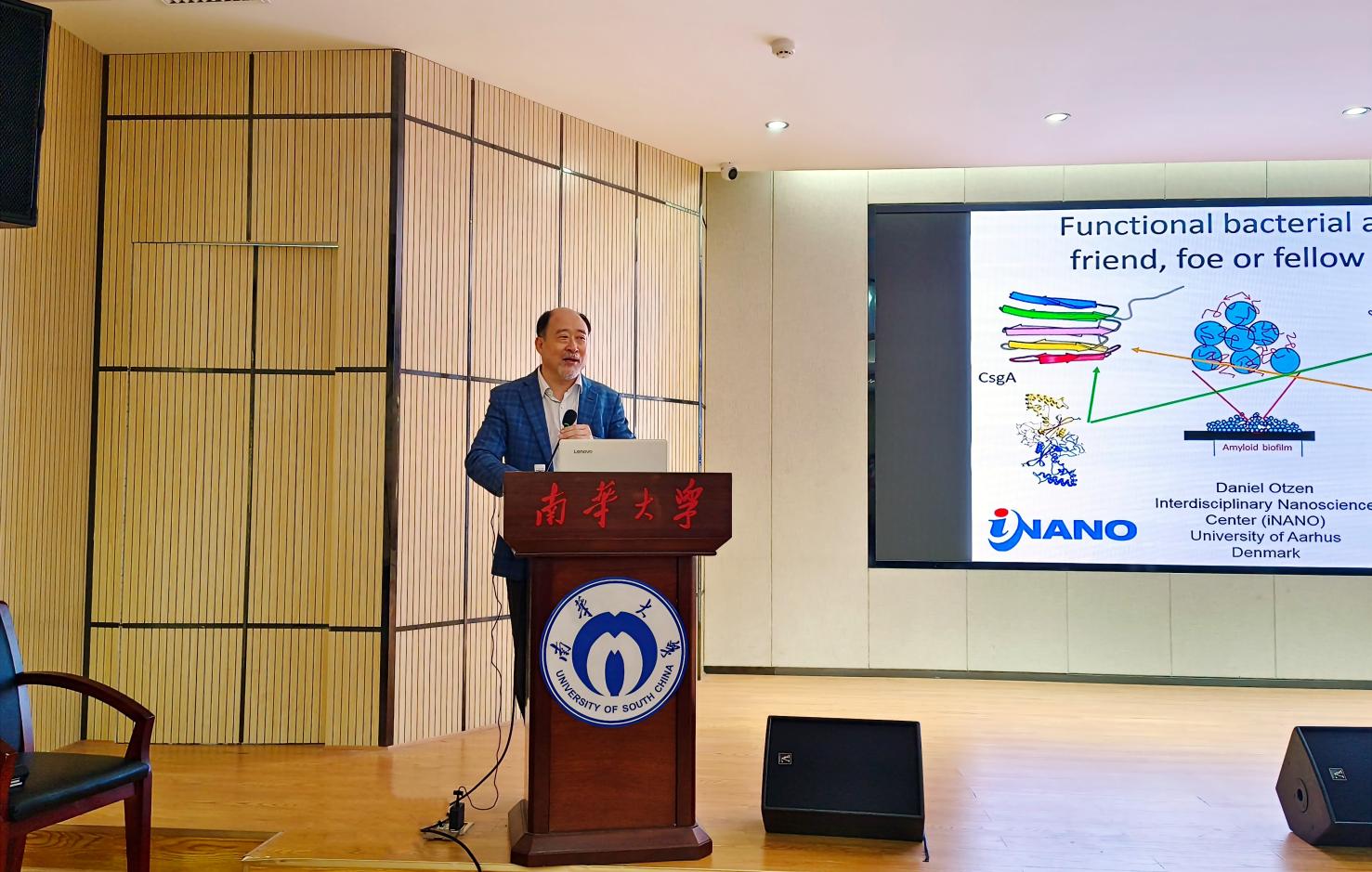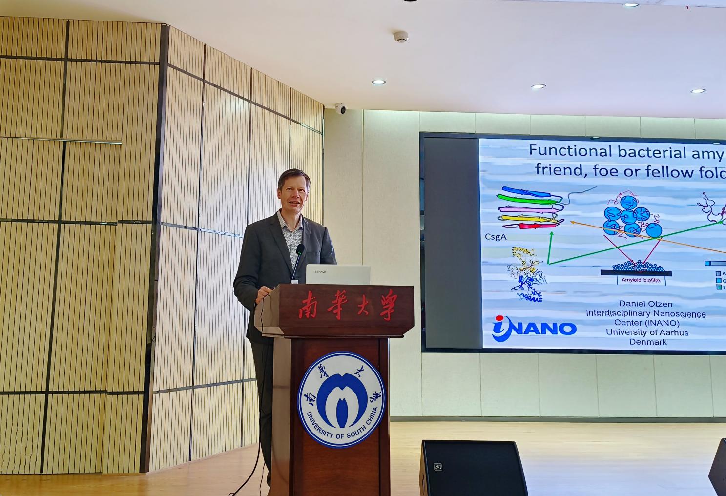 Daniel Otzen以“Functional amyloid in bacteria: friend, foe or fellow folder”为题,深入浅出地为到场师生呈现了一场精彩的知识盛宴。他分享了功能性淀粉样蛋白方面的前沿的科学问题,从蛋白的聚合与疾病的关联出发,深入阐释了细胞及细菌中功能性淀粉的聚集及折叠机制,以此筛选了功能性淀粉样蛋白肽链上的靶点,设计了抗聚集多肽,为抑制蛋白质聚集指明了方向。Daniel Otzen的研究对解决阿尔茨海默氏症等脑神经疾病具有重大的意义。