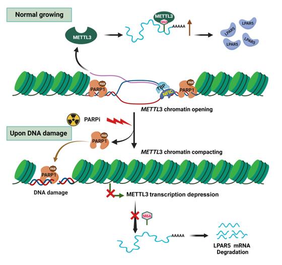 PARP1调控METTL3的染色质开放性,以调节其转录和下游的RNA的m6A甲基化的关键机制图