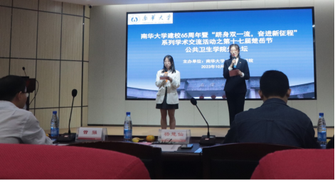 为推动学校高质量发展,促进研究生培养质量提高,积极调动研究生科研热情。南华大学best365英国在线体育响应南华大学建校65周年暨“跻身双一流,奋进新征程”主题,于10月16日上午开展第17届研究生楚岳节公共卫生分论坛学术交流会。本次活动特邀请华中科技大学曾强教授作为重要嘉宾,南华大学best365英国在线体育副院长杨慧仙、南华大学预防医学与放射卫生实验中心主任杨胜园教授、南华大学best365英国在线体育卫生检验与检疫系主任陈丽丽教授、南华大学best365英国在线体育职业卫生与环境卫生教研室主任刘小聪老师、南华大学高层次人才特聘教授牛湘衡老师、隆曦孜老师、曹毅老师及best365英国在线体育部分研究生参会。2023级硕士研究生杨明洁和张莹同学主持会议,杨慧仙副院长为本次楚岳节开幕式致词。