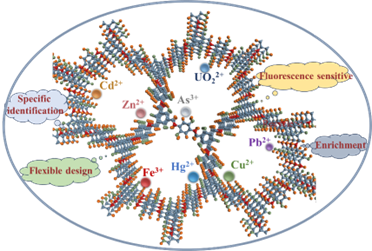 共价有机框架(COFs)是由分子构筑单元通过强共价键连接而成的,具有质量密度低、比表面积大、孔结构可控等特点,是一种非常有前景的荧光传感材料。利用共价键将各种具有π共轭平面的发光单体组装,构建高度有序的2D或3D拓扑骨架,通过官能团的设计和修饰,可实现金属离子的选择性识别和特异性荧光检测。